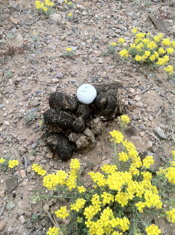 There’s been a mysterious golfer — maybe more than one — around here for years, driving balls off mesa tops and landing them perilously close to the windows of my faux-adobe hideaway. So far, no harm done. But if he or she ever beans one of Placitas’s free-roaming horses, who also regularly leave things in my front yard, I’m sure a posse will be organized.