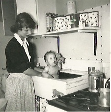 A Twitter exchange involving tamale pie and “The Joy of Cooking” led me to investigate this photograph of my mother and youngest brother, both now deceased, during our residence in a trailer house on blocks somewhere near Iowa City, Iowa, in 1954 or ’55. Dad was was working on his master’s at the Writers’ Workshop; Mom was caring for three boys. Retrieving the photograph, I initially dwelled on my mother’s beauty and happiness, despite the low-rent surroundings, but I really was checking out the cookbook on the far end of the shelf. I had been prepared to fire off a tweet showing my “Joy of Cooking” credentials, but close examination revealed that this cookbook actually is the Better Homes and Gardens guide to post-war cuisine. An ironic selection, maybe, given my mother’s environment. But the greater reminder here is that she had a halo about her regardless of what concoction — no doubt involving a can of Campbell’s Cream of Mushroom soup — she might have been preparing for supper. Here’s the tweet and a wonderfully written essay that propelled this runaway train of thought: