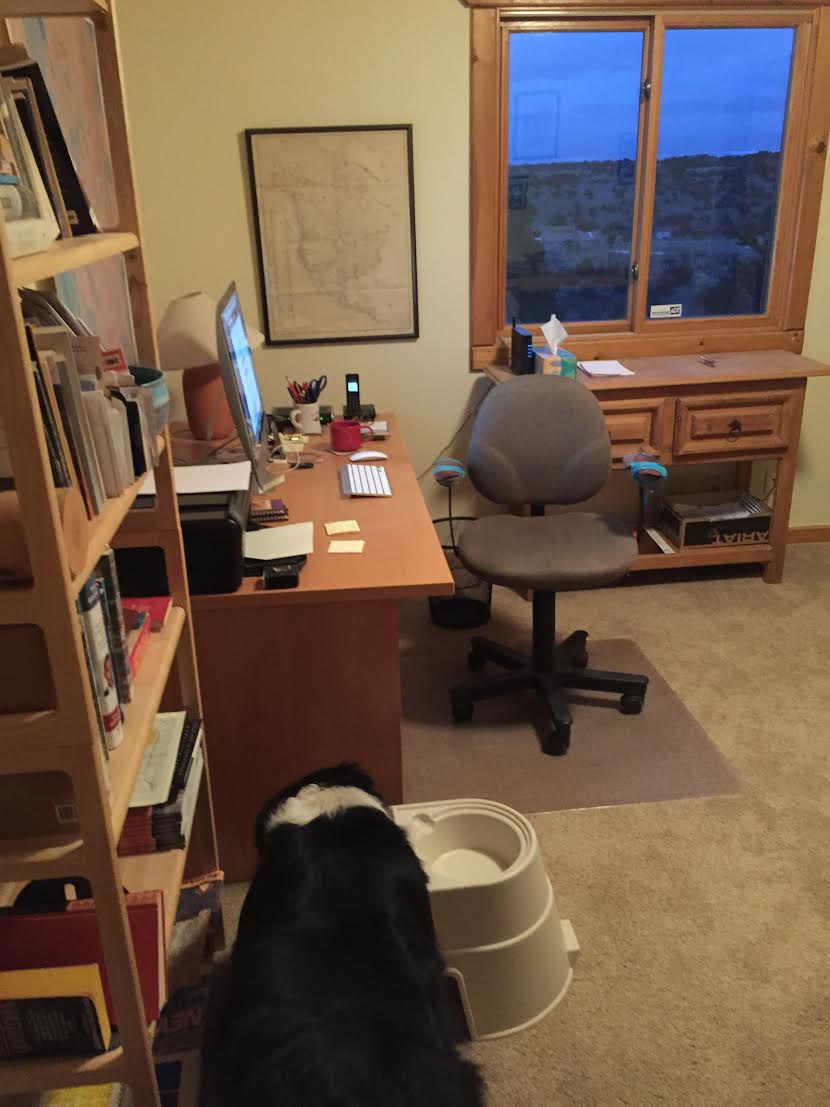 — I started giving Cooper his breakfast in my office before I head to Albuquerque for cancer treatments, (just a few more to go). He chows down at my side while I have a cup of coffee and rattle around on the iMac. We walk later.