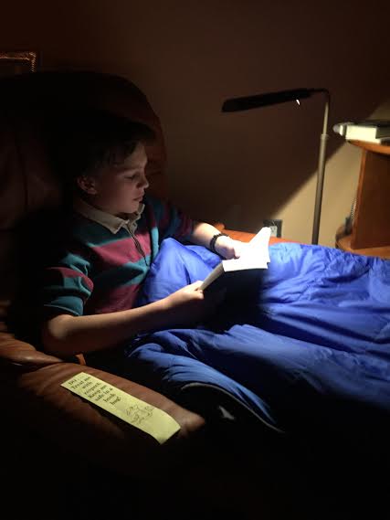 But it also gives me an excuse to post this picture of my nephew, Will, taking over my lamp and chair last night and reading his Harry Potter before going to bed.