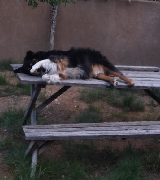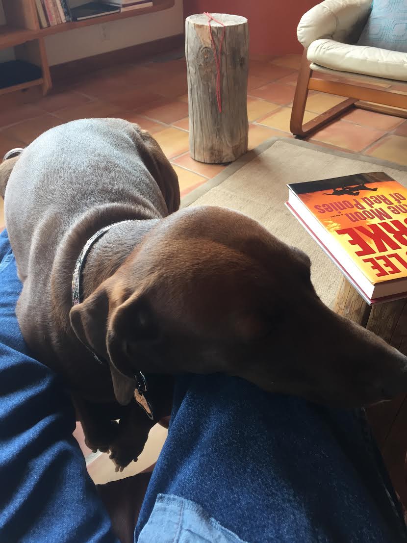 Our neighbor friend Sara probably would have preferred that I bought a full-fledged recliner instead of this chair and footstool arrangement, but she has figured out how to make it work for her: backside on the stool, chin on my knee, not bothered by the gap in between.