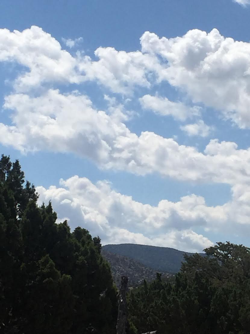 Clouds gathering now and we hear thunder over the Jemez. Exciting to me but, I have to remember, not welcomed by everyone here. Cooper has taken cover beside my desk.