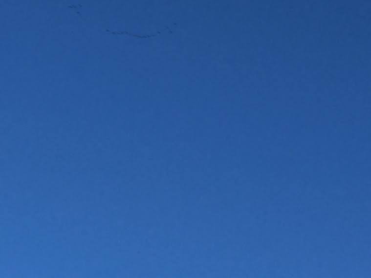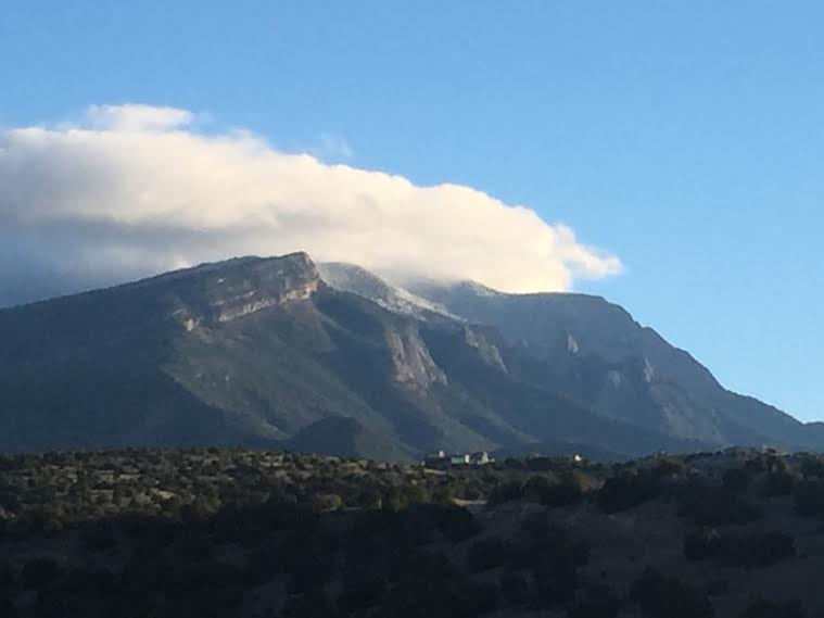 New snow on the mountain top today and sandhill cranes overhead. If you look real hard in the upper left of my iPhone snapshot, you can see a line of them on their way down to Bosque del Apache. Thanks to Lori for the heads up. Maybe, one of these days, I’ll start packing a bigger lens.