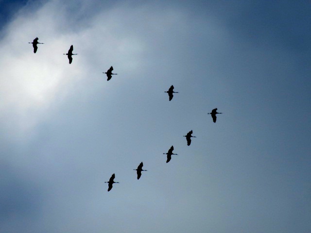 Cold today after Monday’s snow and a bunch of Sandhill cranes apparently decided to make a break for it in their trip down the Rio Grande. Hundreds above Placitas this afternoon, perhaps seeking a thermal for a shot south. Fortunately, neighbor Lori heard them and alerted me — being a sissy indoors and putting off my afternoon walk — by cell phone. And, also fortunately, brother-in-law Bill recently worked me through some of my camera ignorance, enabling me to finally get my quick-draw, pocket camera lense on the graceful and talkative snow-dodgers overhead.