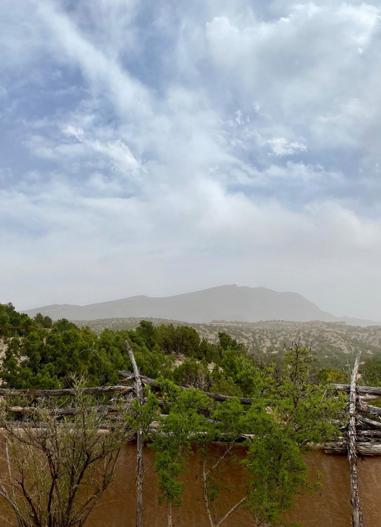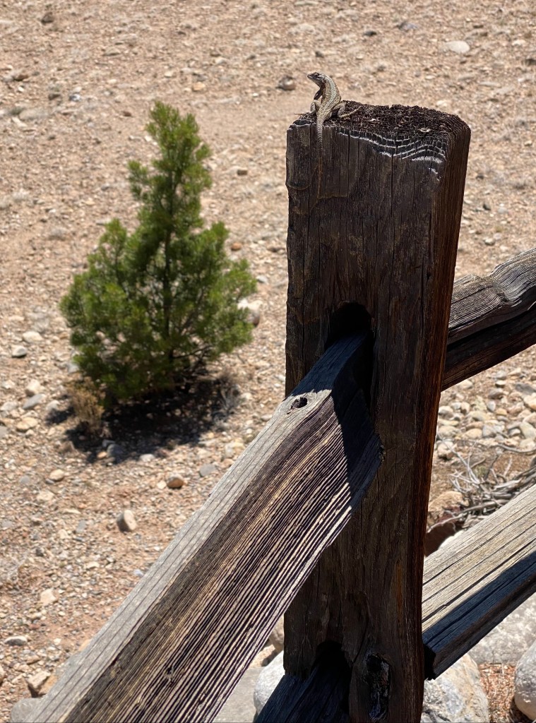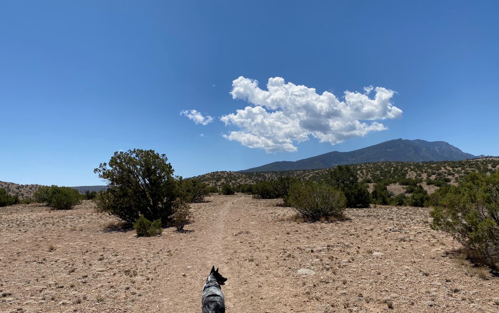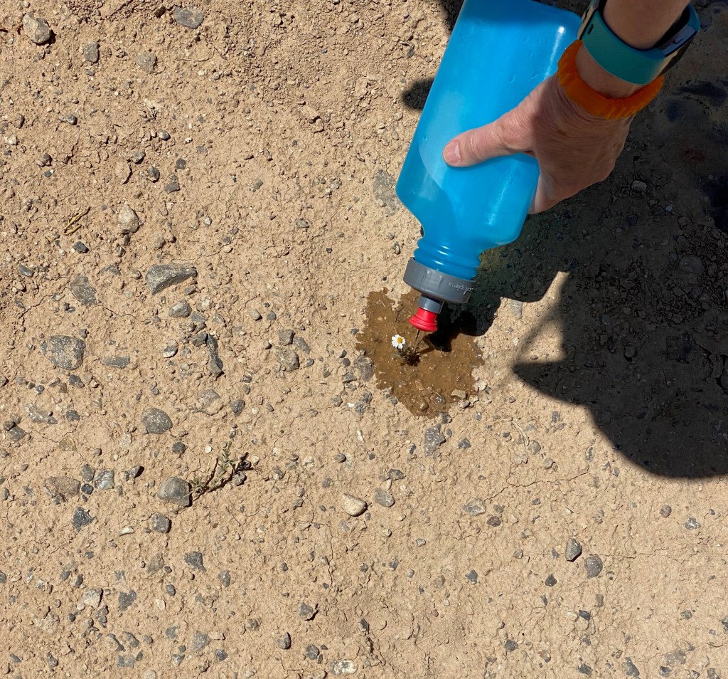 Cowboy surveys a mesa that after a wetter spring would be blanketed with yellow Fendler bladderpods. Our walking friend Lori gives a drink to a Blackfoot Daisy. Perky Sues are few and far between. The latest haboob clouds the watermelon mountain and a ridgetop subdivision. Survivors include a whiptail lizard and a piñon seedling passed on to me almost 30 years ago by Manny Aragon.