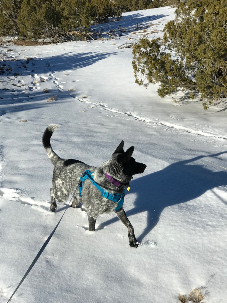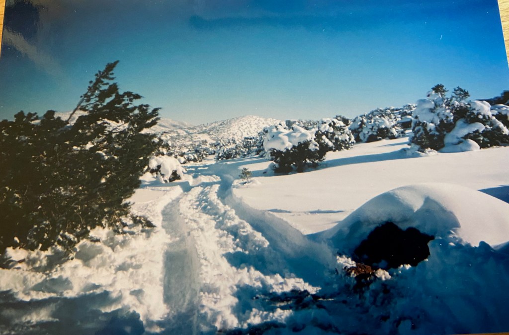 It does seem that we got more consistent snows in the 1970s. I think this impression stems mostly from another dog and I, Mus — short for Mustafa — being overtaken by a big, slow storm in the Bandelier backcountry on Christmas day around 1973. I got a hint of what was to come the night before when Mus aligned himself with my sleeping bag inside the tent on Upper Frijoles Creek. (I think the backcountry rules were different in those days). We hurried out after a Christmas Eve on frozen ground in Capulin Canyon. It started snowing as we passed the Stone Lions and was dumping a couple of feet by the time we got back to Santa Fe.