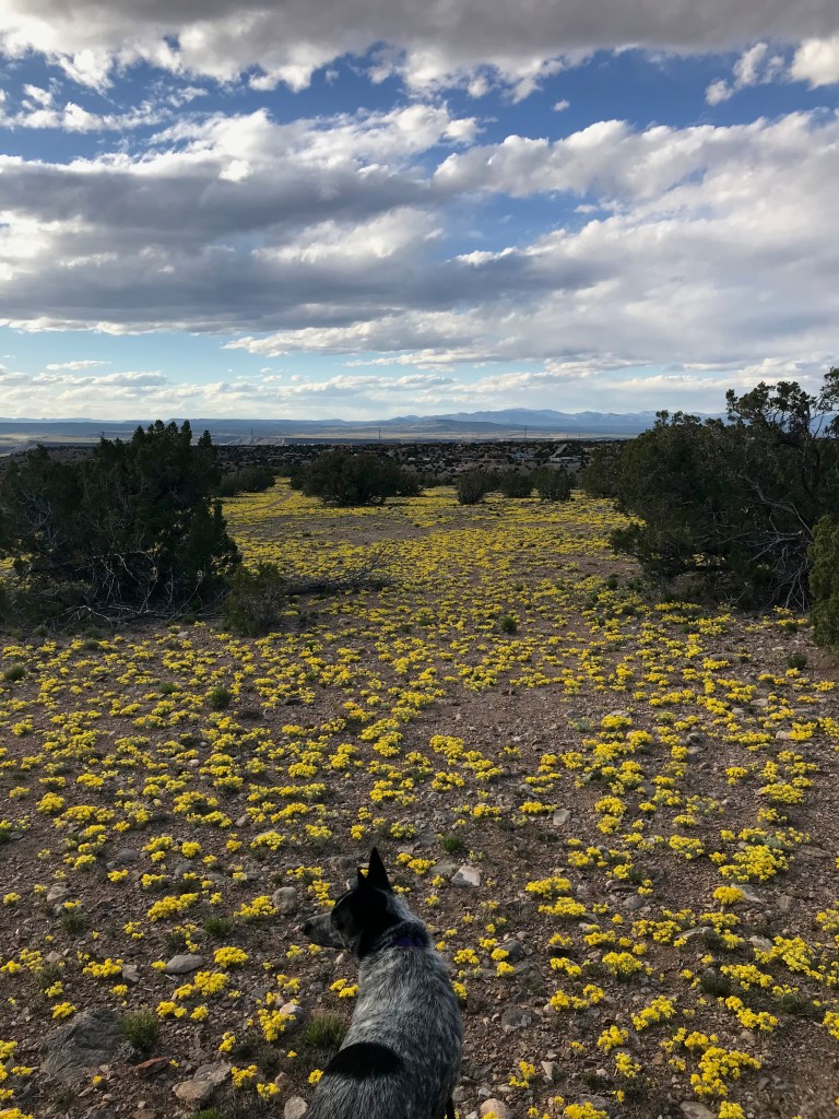 Poor Cowboy has seen snow in the past, here in January 2019, and wildflowers three months later in April.