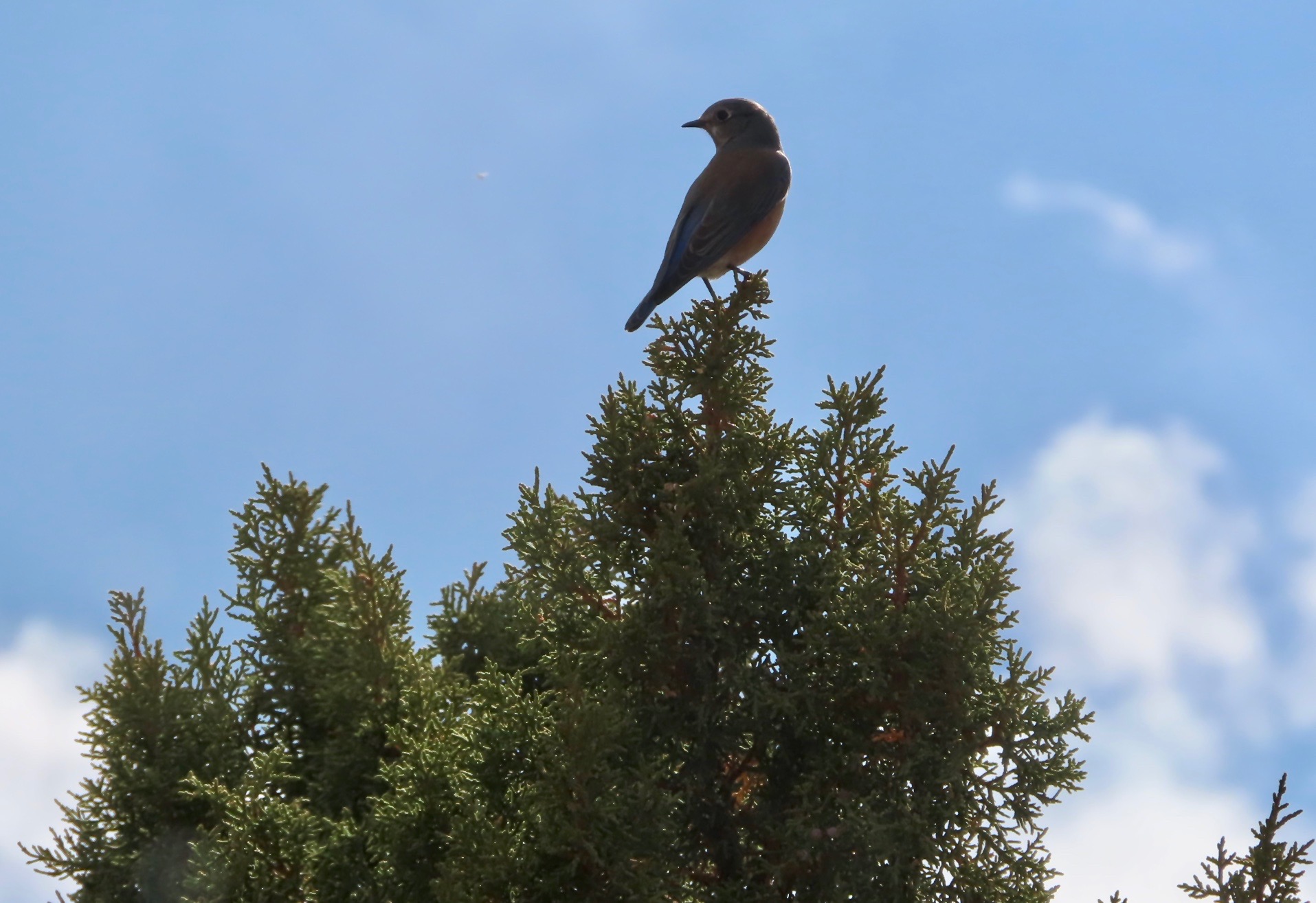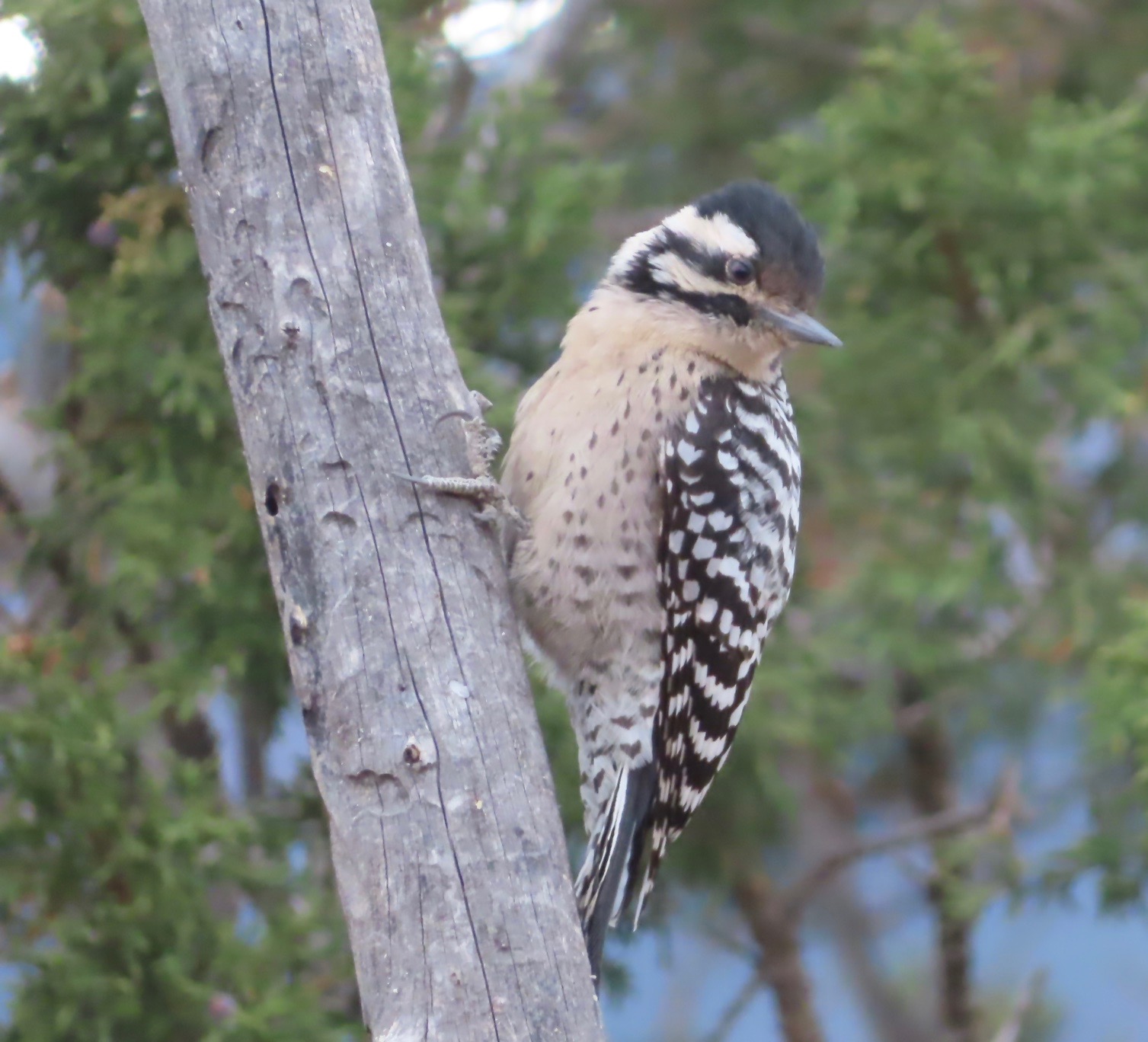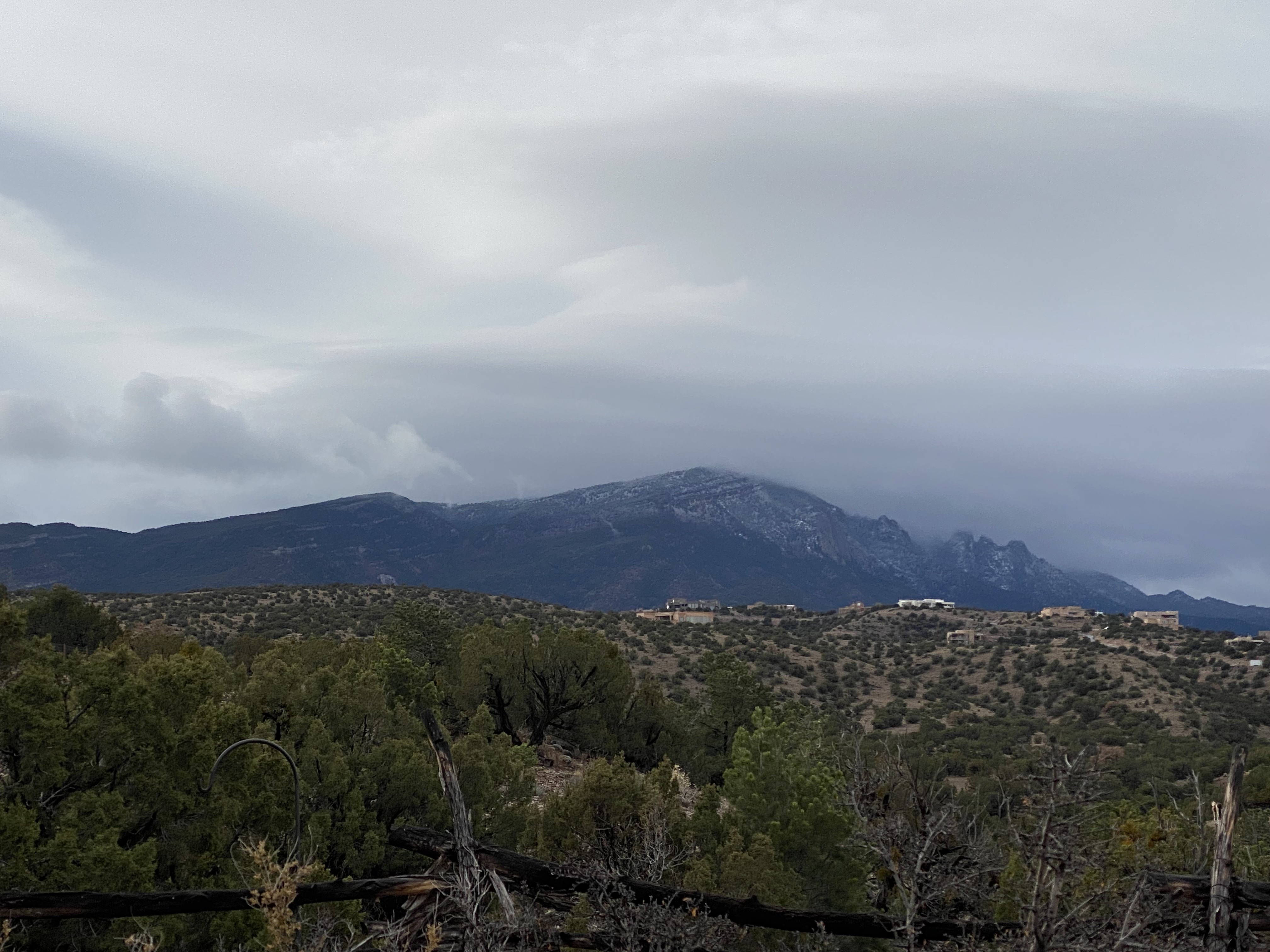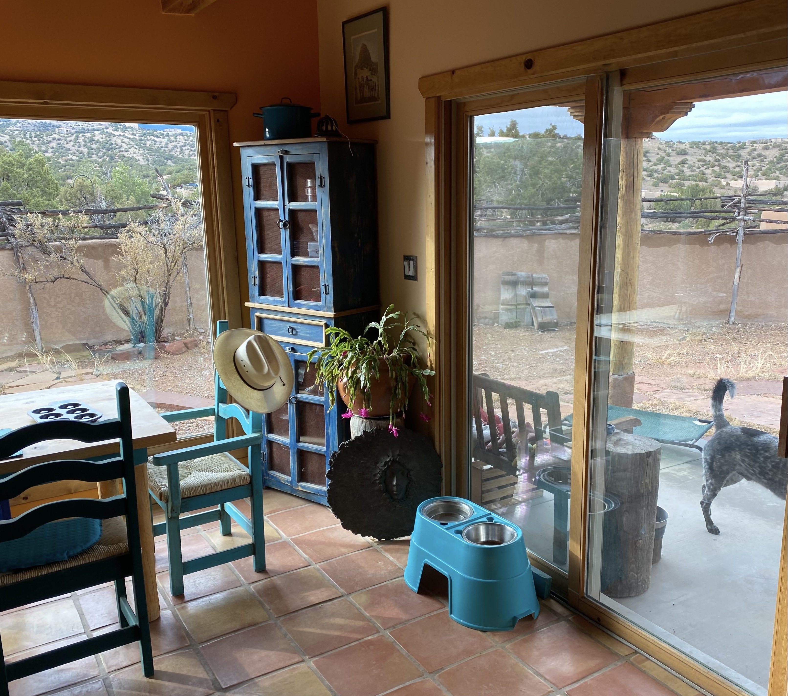 Young Ladderback eyeing my feeder; snow on the mountain; possibly New Mexico’s toughest Christmas cactus blooming; first Western Bluebird sightings at 6,000 feet.