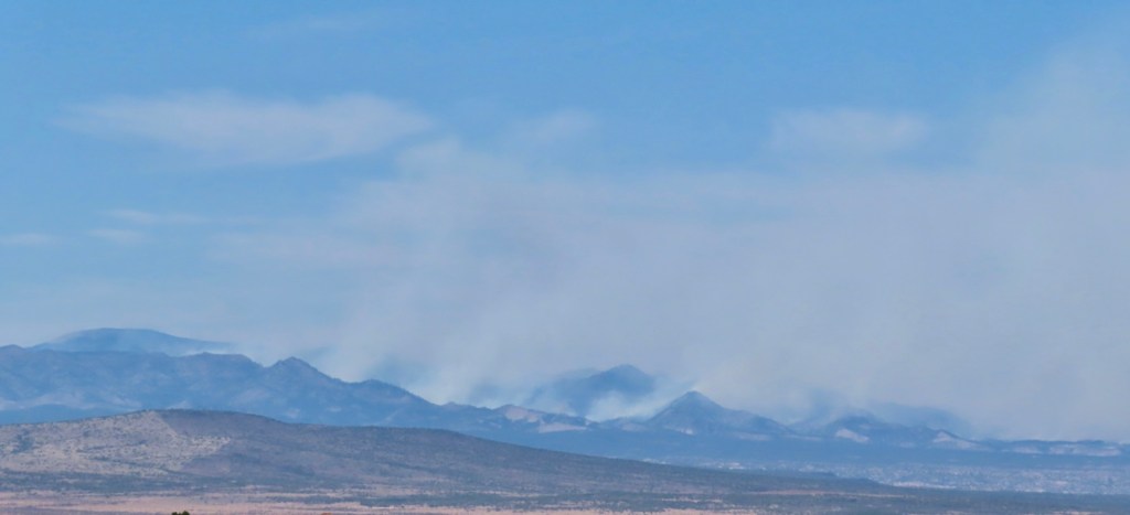 The Cerro Pelado fire in the Jemez Mountains, photographed from Placitas, spotting east on April 30. The fire started in what pundits called a big “wind event” on April 22 — Earth Day, by the way. It has burned into the 2011 Las Conchas burn scar but still threatens cabin clusters on several sides and “cultural resources,” namely sacred pueblo locations, to the south. Los Alamos is about 10 miles to the north. The treasured Valles Caldera, at the foot of Redondo Peak at the left of this frame, is closer, although still north of the fire this morning. The fire is just west of Bandelier National Monument this morning.