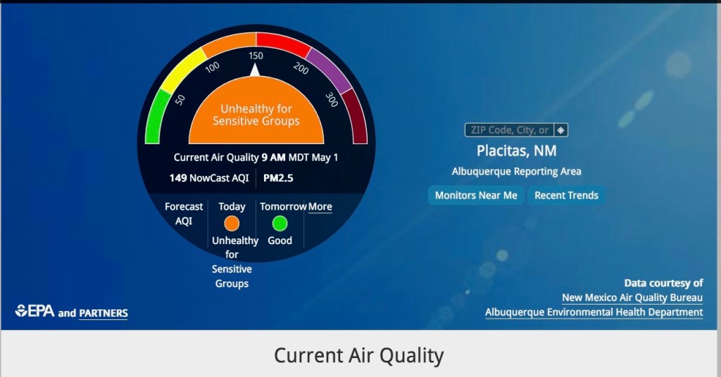Cerro Pelado is throwing off a lot of smoke. Santa Fe, to the east, has been inundated for days but the smoke shifted to the south overnight and the upper Middle Rio Grande Valley is getting a lot of it today, 05/01/22.