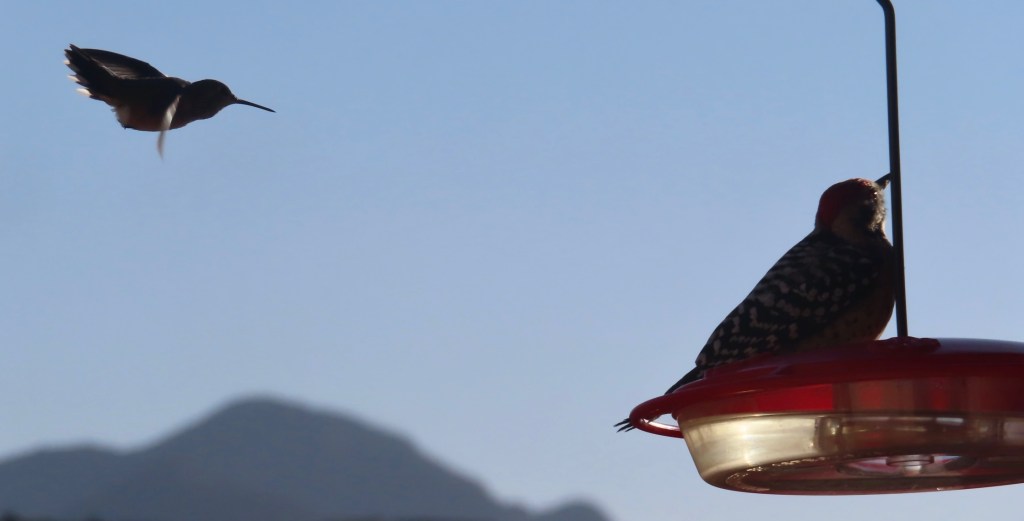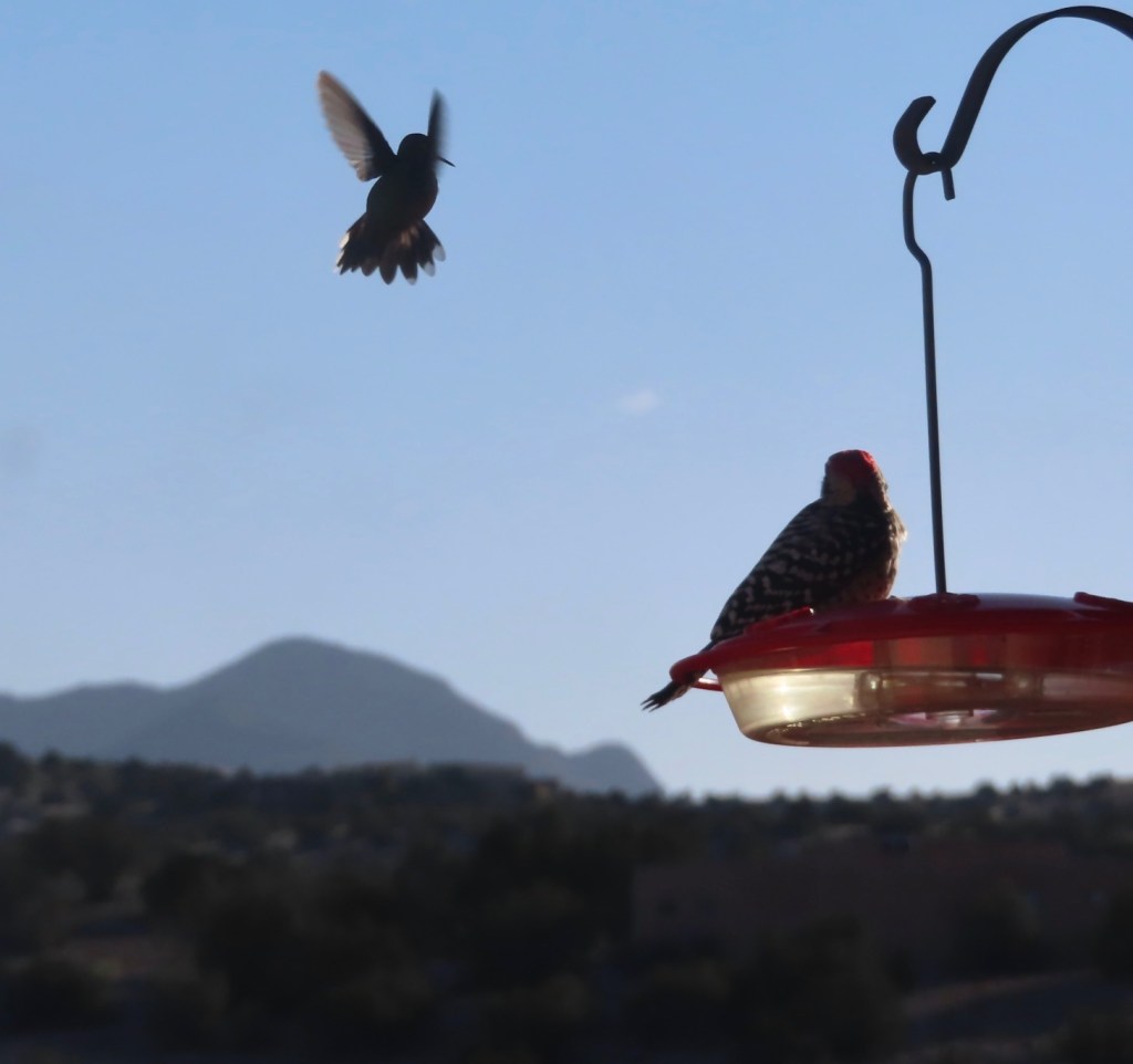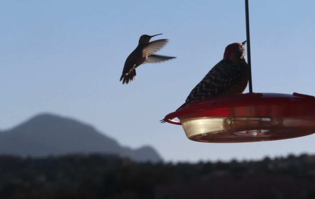 It snowed earlier. Later in the day, this woodpecker wouldn’t budge from my neighbor’s hummingbird feeder. The hummingbird didn’t seem happy.