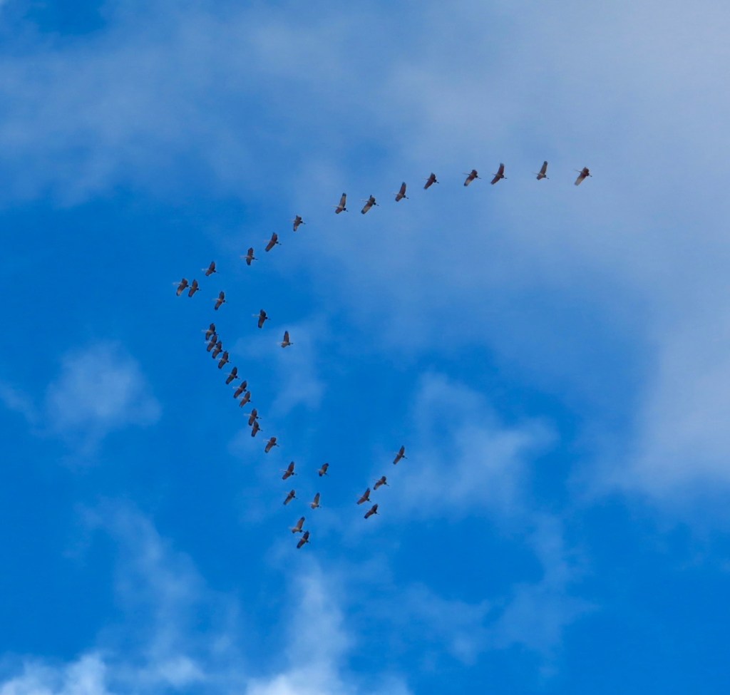 When the counter is full at the Range in Bernalillo, I’m glad I live in a place where I can point the truck north on old 66 to Abuelita’s or Twisters, near the route of Coronado and homes of Puebloans who were already there, then east toward Placitas where Las Huertas Creek runs from a Sandia mountain canyon to the Rio Grande and close to that confluence at home consume my carry-out combination plate with green and sleep it off in a living room chair facing piñon-juniper foothills so quiet the croaking of sandhill cranes overhead wakes from me from an endorphin-ensured nap, satisfied by the chile-covered food, as the birds flying down from Utah, Colorado, Wyoming, Montana and Idaho circle upward, seeking a thermal for the flight south to Bosque del Apache for feasts on fields of winter grain.