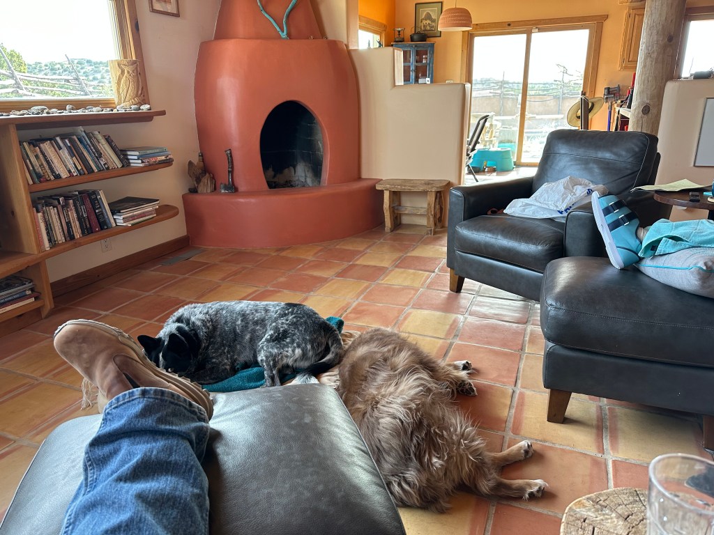 Recovery room: Neighbor with surgically repaired foot, friendly dog and lousy tv reception came over to watch BBC comedies on the dream ranch tube while spring winds gusted to 50. Cowboy stoic but watchful.