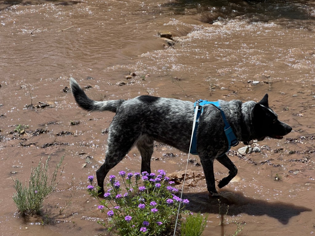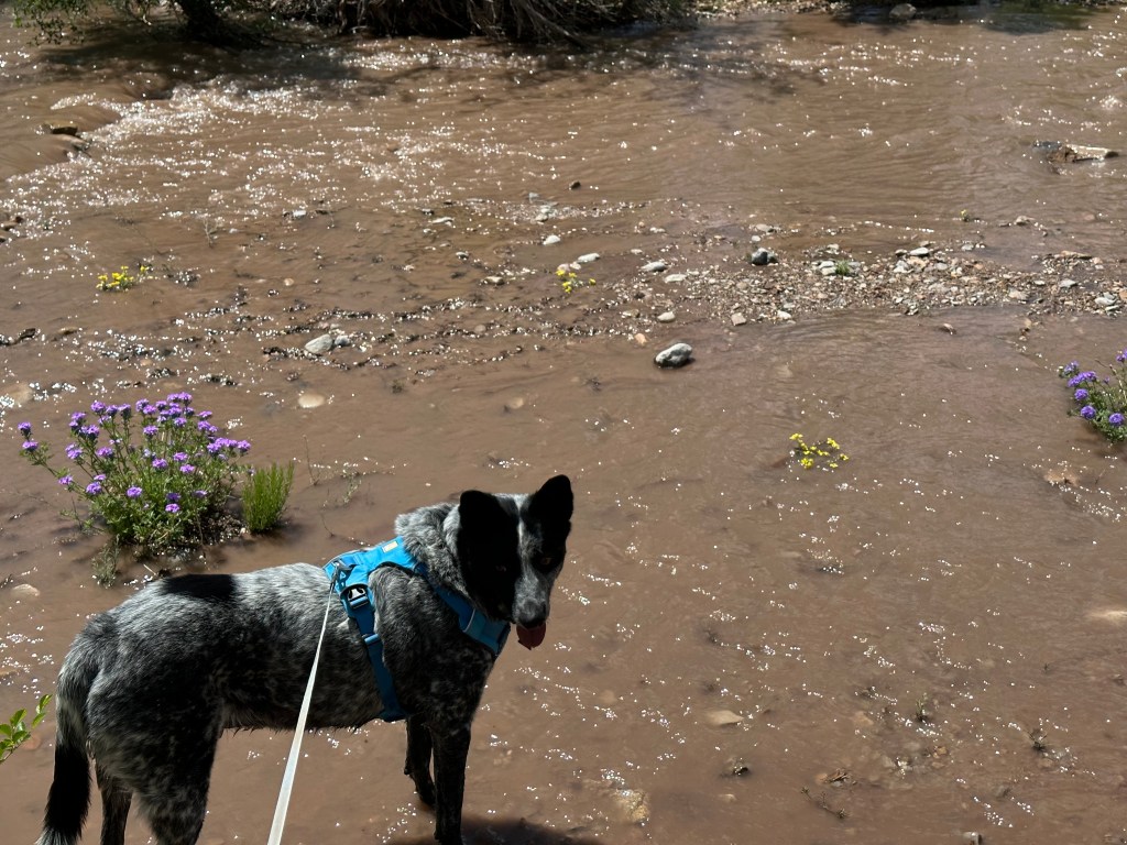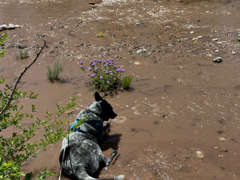 Cowboy wasn’t feeling great this morning but he perked up as any New Mexican would at the sight of spring runoff in lower Las Huertas Creek. The creek ran more often during the lifetimes of my three previous dream ranch dogs, Sadie, Molly and Cooper. Even Orno Creek just below us used to run most springs. Orno retained a pool and Sadie and Molly cooled off in it after hikes. Kind neighbors keep a pool for Cowboy on the bank of Las Huertas but after seven dry years here I think this was the first time he’d seen the creek flowing below the canyon, not counting flash floods.