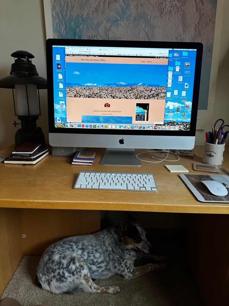 Cowboy2, like at least one his predecessors, seems to have found a safe place during the thunder and lightning of monsoon storms. If I put my feet on his paws, he even stops trembling. Cooper, although he also used the adobe fireplace, also took cover under the desk. I hope this guy senses that. He’s been here for eight months now and this is his first summer, although he came from Utah, where he reportedly was living outside.