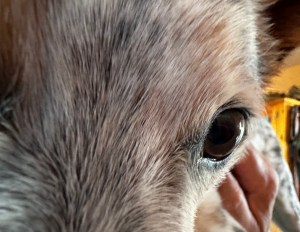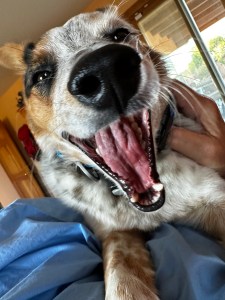 This morning’s Cowboy wake-up racket started an hour ago, as always, at the crack of dawn. My still-under-the-covers biographical reviews are interrupted first by squeaky toys. If that doesn’t work, shoes are swung by the strings to thud against the glass of the patio door. Next, if I am still feigning sleep, is the surprisingly loud gnawing on a Nylabone. The gnawing, of course, is done near the dog door so the door, triggered by an electronic collar, keeps going up and down. In between these tactics, my spotted coyote-looking critter trots back and forth through across the bedroom, with a trip through the door each time, from the picnic table surveillance site on the south side of the house to the rabbit-watching window on the north.