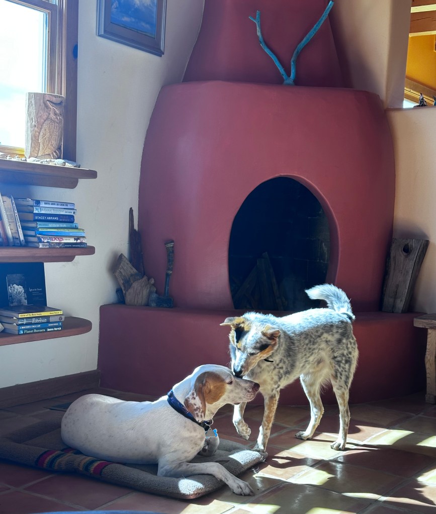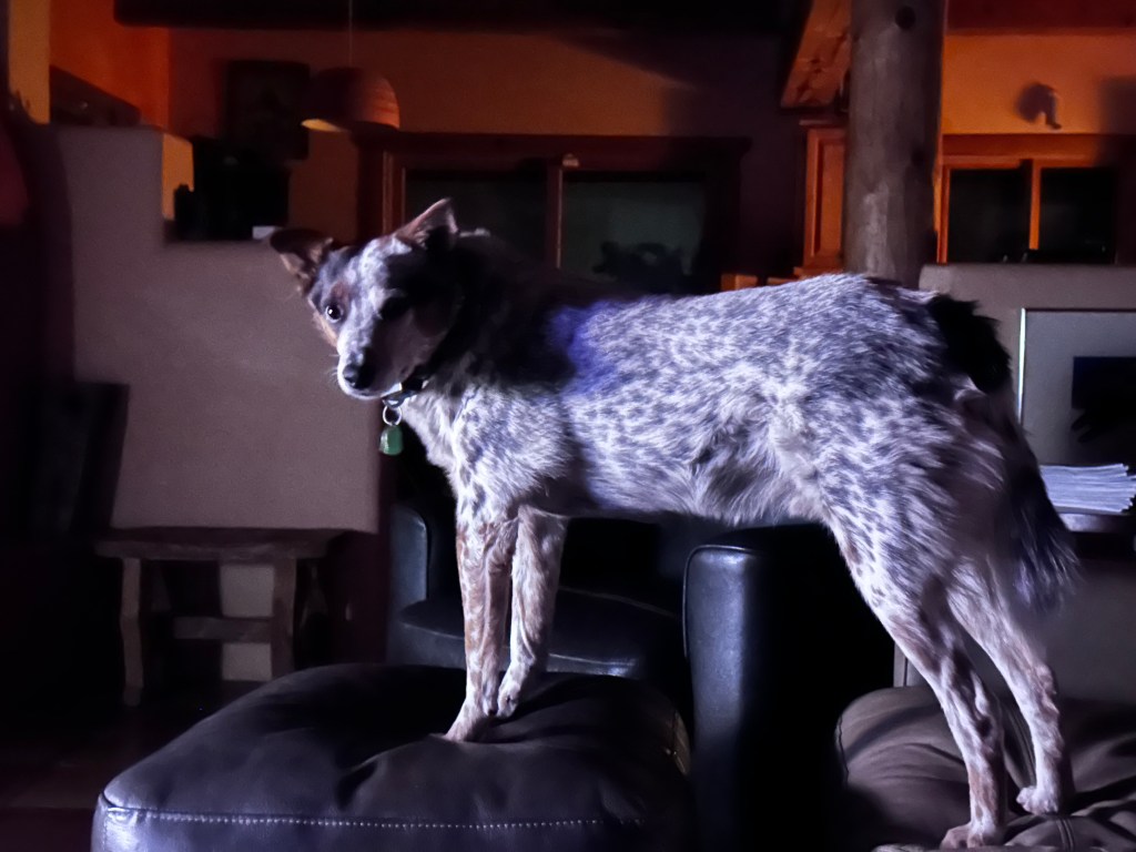 Cowboy 2 stretching in the light of the TV, suggesting that it’s time to go to bed.