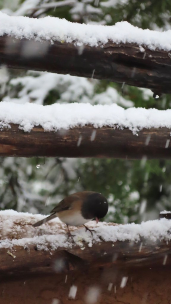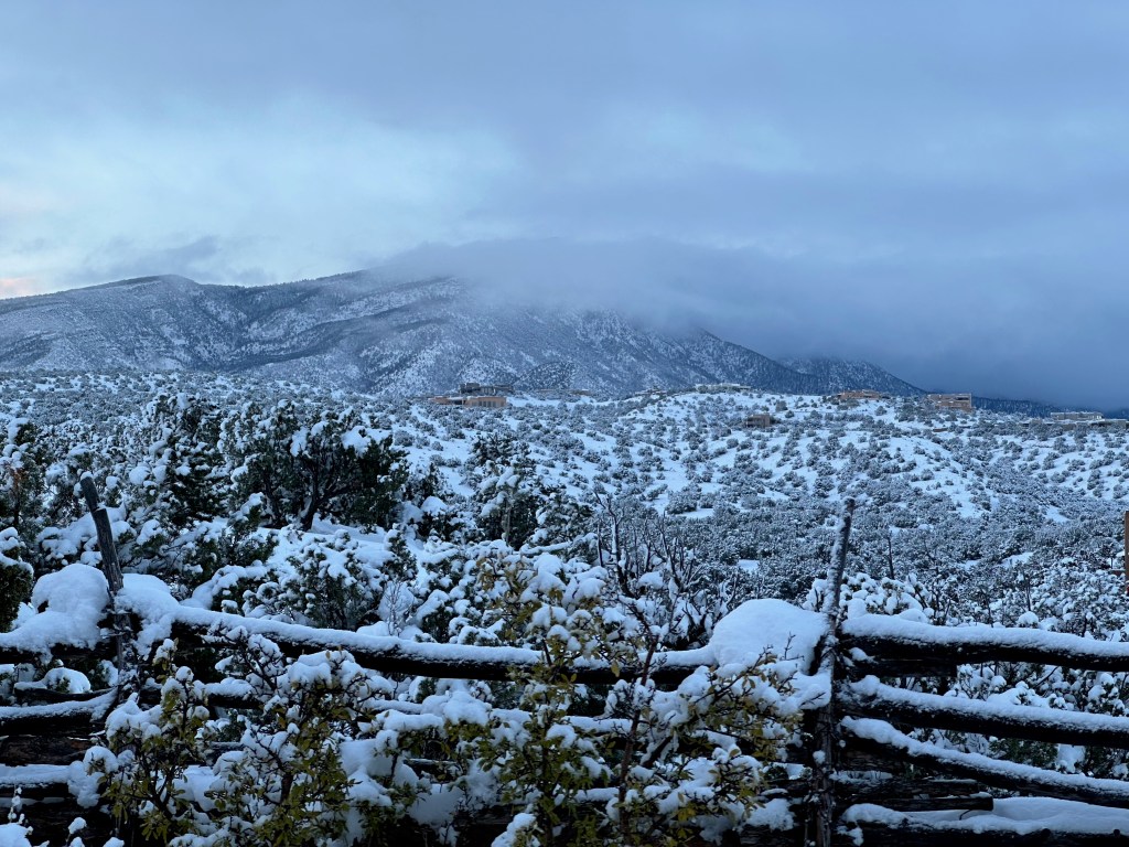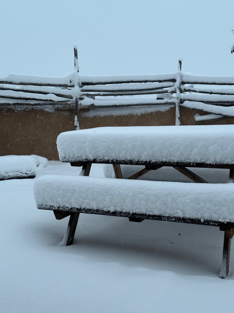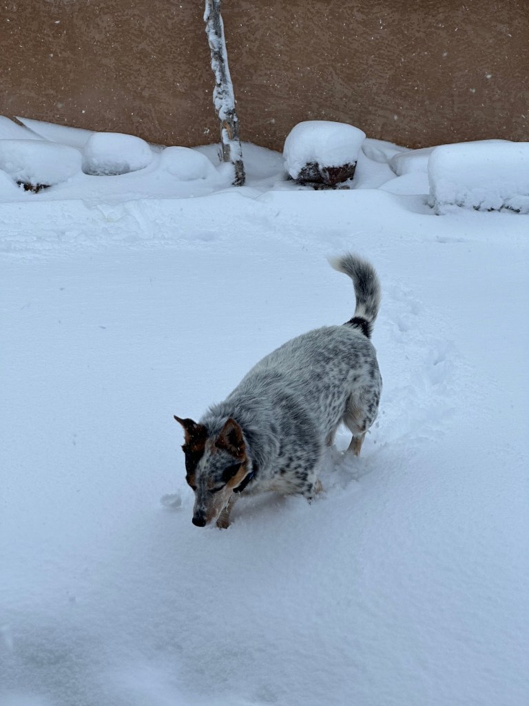 It snowed before and after the November 5 election and probably was the best snow we’ve had at my 6,000 foot home elevation since 2006. I measured 10 inches on the picnic table on November 7 and there probably were an inch or two more before settling. Cowboy 2.0 started out doubtful but was enjoying it just a few days in.