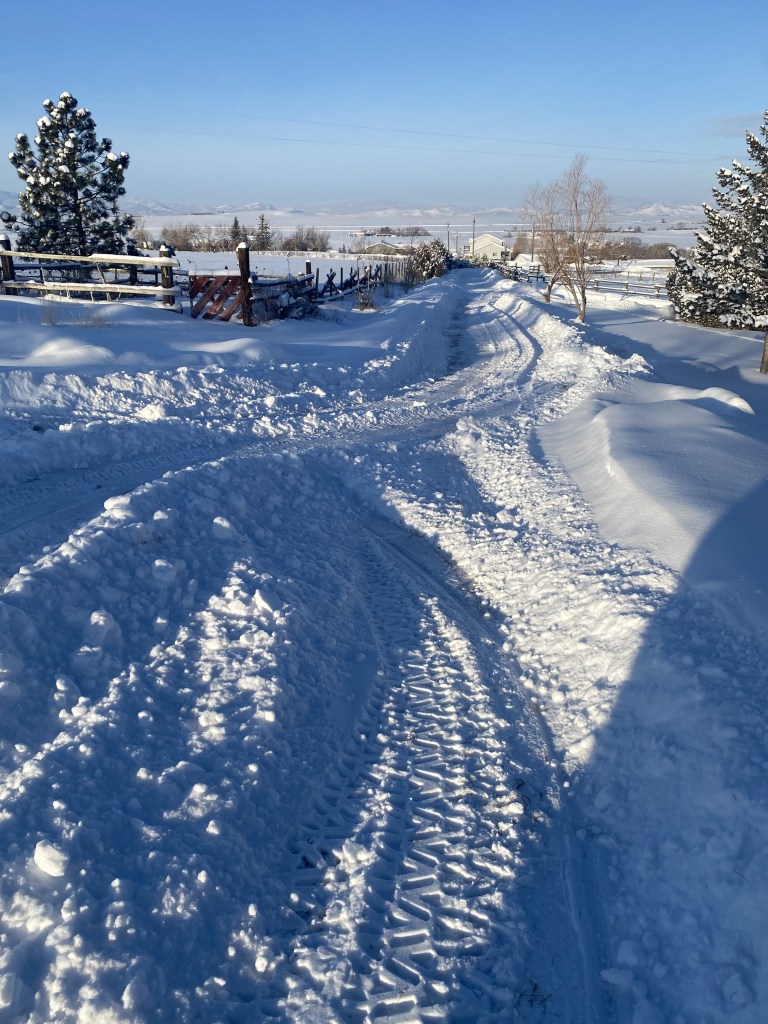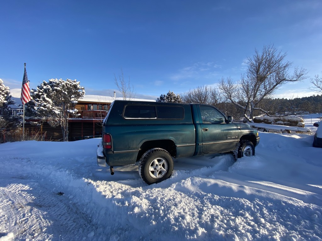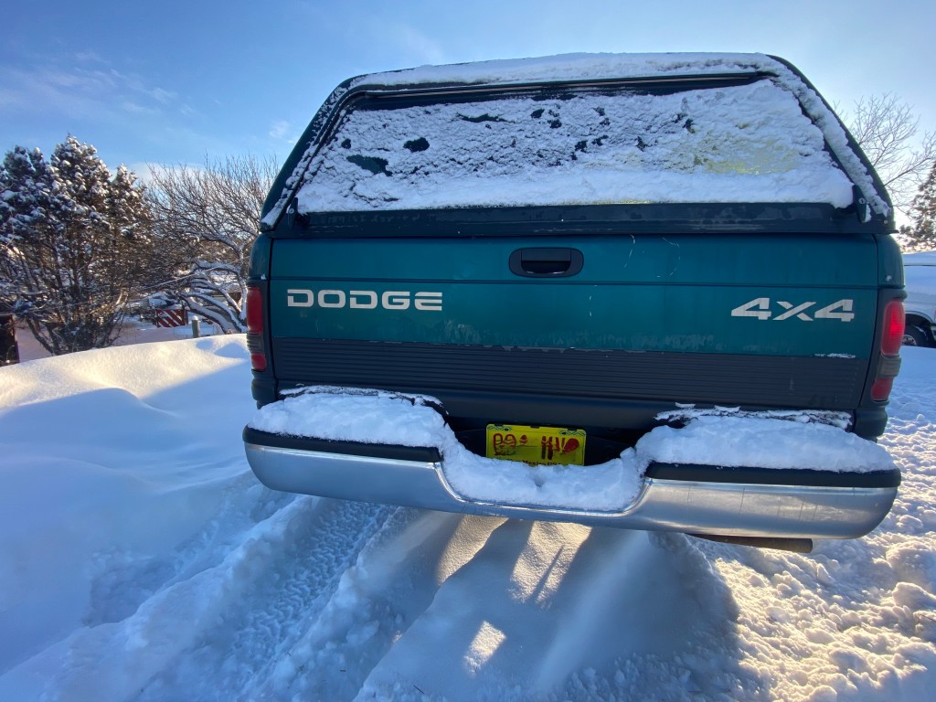 My ’97 Dodge at its new home 02/19/25 in Montana with sister Hope, after a three-day, rough weather drive from Placitas by brother-in-law Matt. I felt like I was sending a kid off to college.