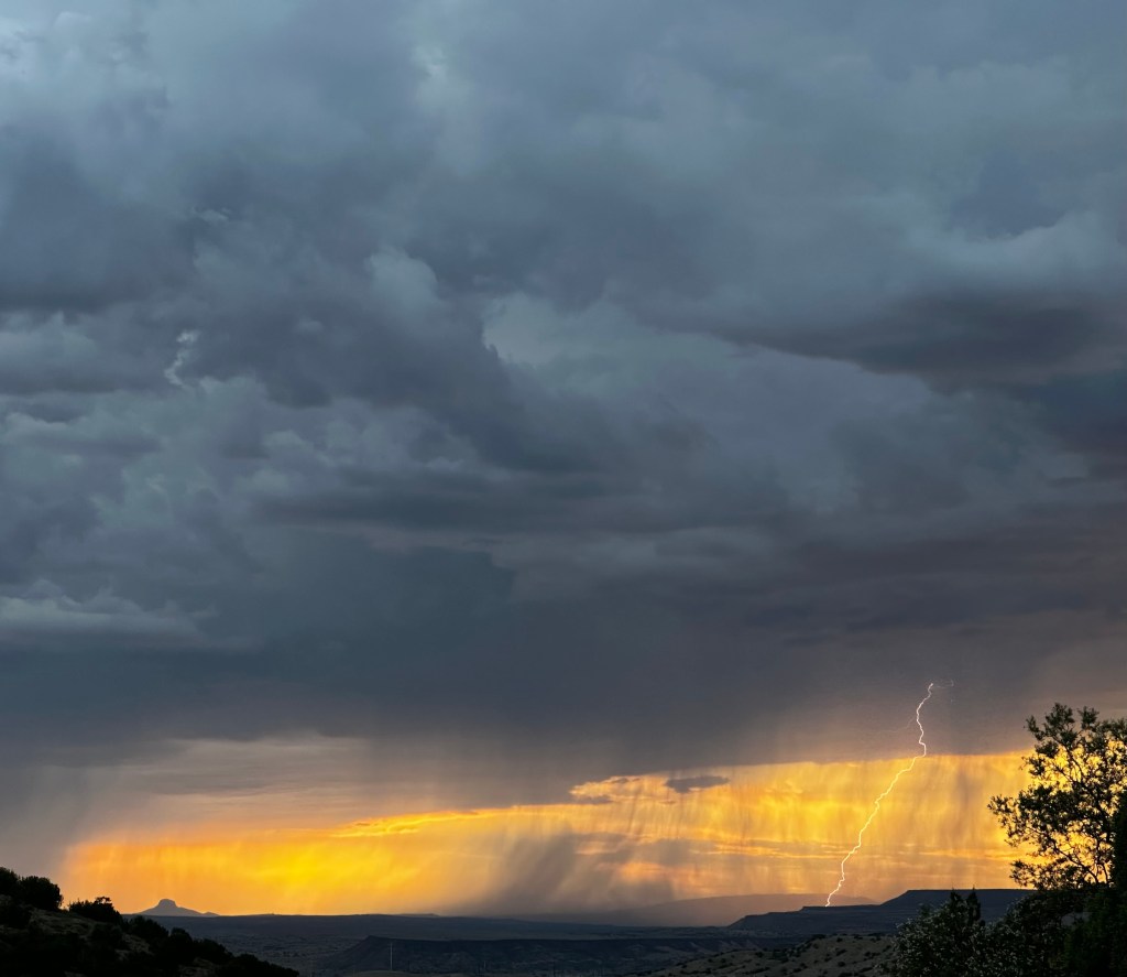 Lightning strike, Cabezon area, 7:23 pm, September 9. Walking rain north of Cabezón, September 9. The Sandias — or Bien Mur or Oku Pin — illuminated by lightning, 10 pm, September 9.