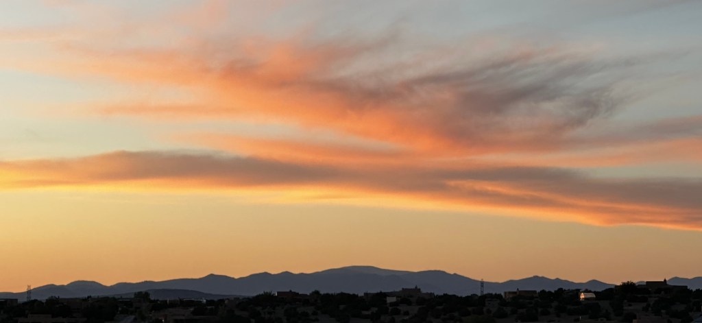 iPhone view from Placitas northeast toward Santa Fe, looking over the Cuchilla de San Francisco, opposite sunset, May 16, 2024.