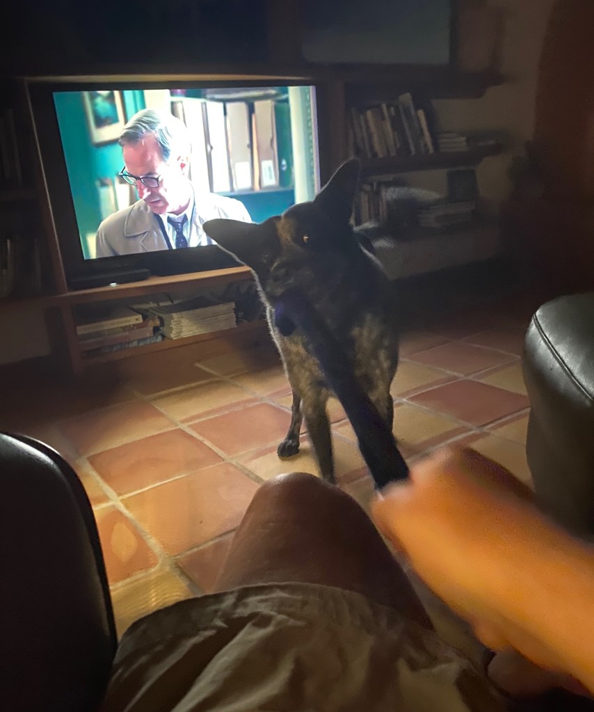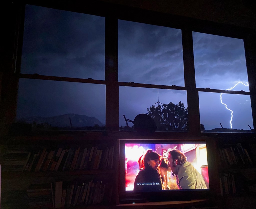 The lightning started during “Grantchester” and continued through “COBRA,” nearly two hours. I couldn’t really concentrate on either as cloud-to-ground and cloud-to-cloud bolts seemed to stretch in a northwesterly arc from Las Huertas Canyon to Santa Ana Pueblo. Took an evening walk with Cowboy before the start and picked up the pace under darkening skies as we headed home.