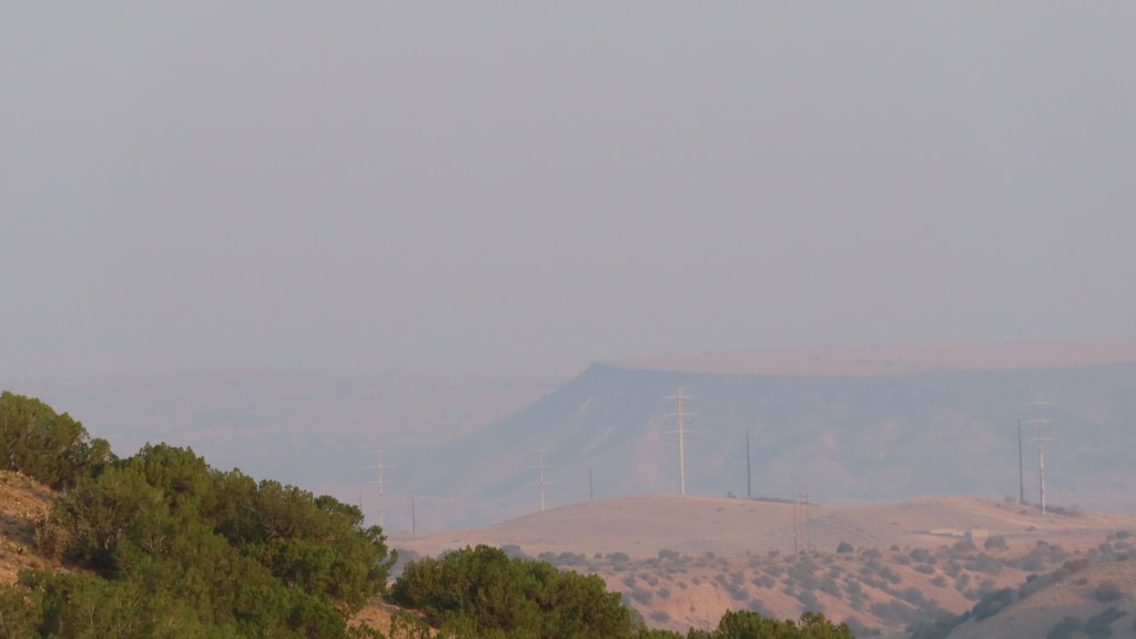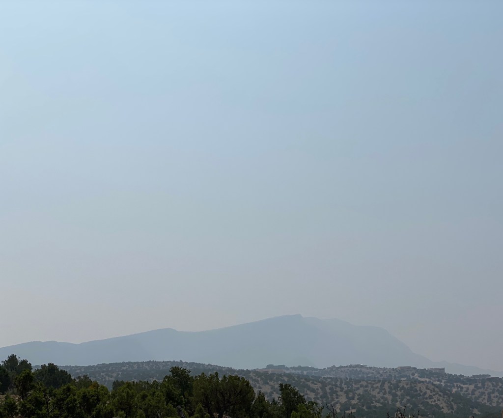 View south to the smoke-shrouded Sandia Mountains, just a couple of miles from me on Lower Las Huertas Creek in northeast Placitas, New Mexico, with 107 wildfires in 15 western states burning over 2 million acres, August 8, 2021, noon.