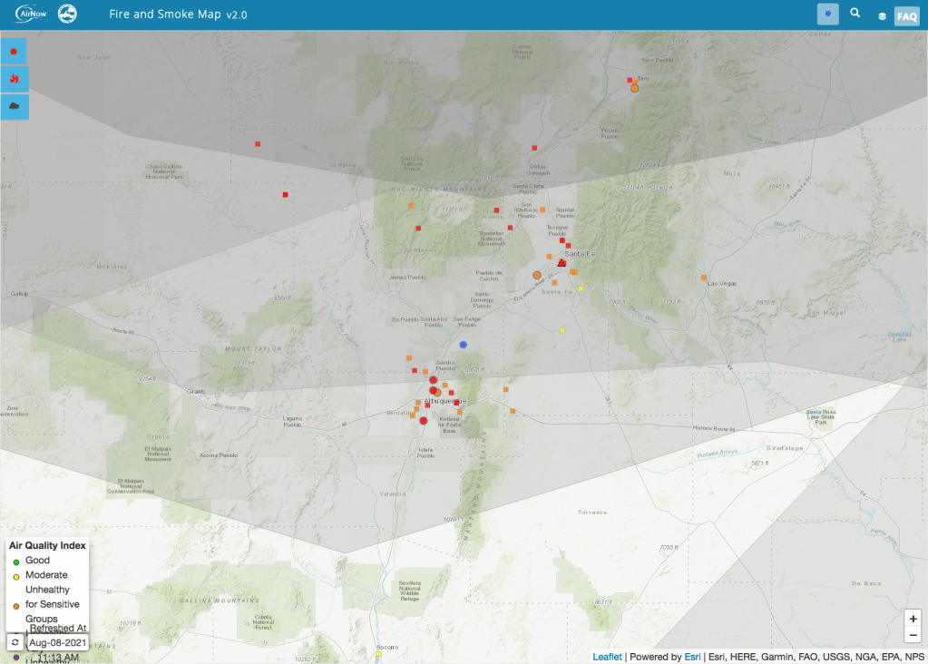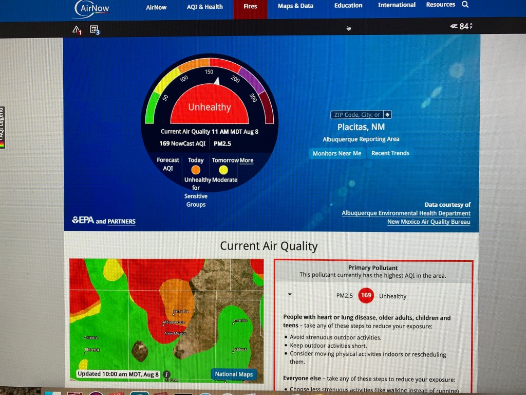 Air quality reading, Placitas, 11 a.m., August 8, 2021. The ozone and smoke count got as high as 174 later Sunday, well into the red.
