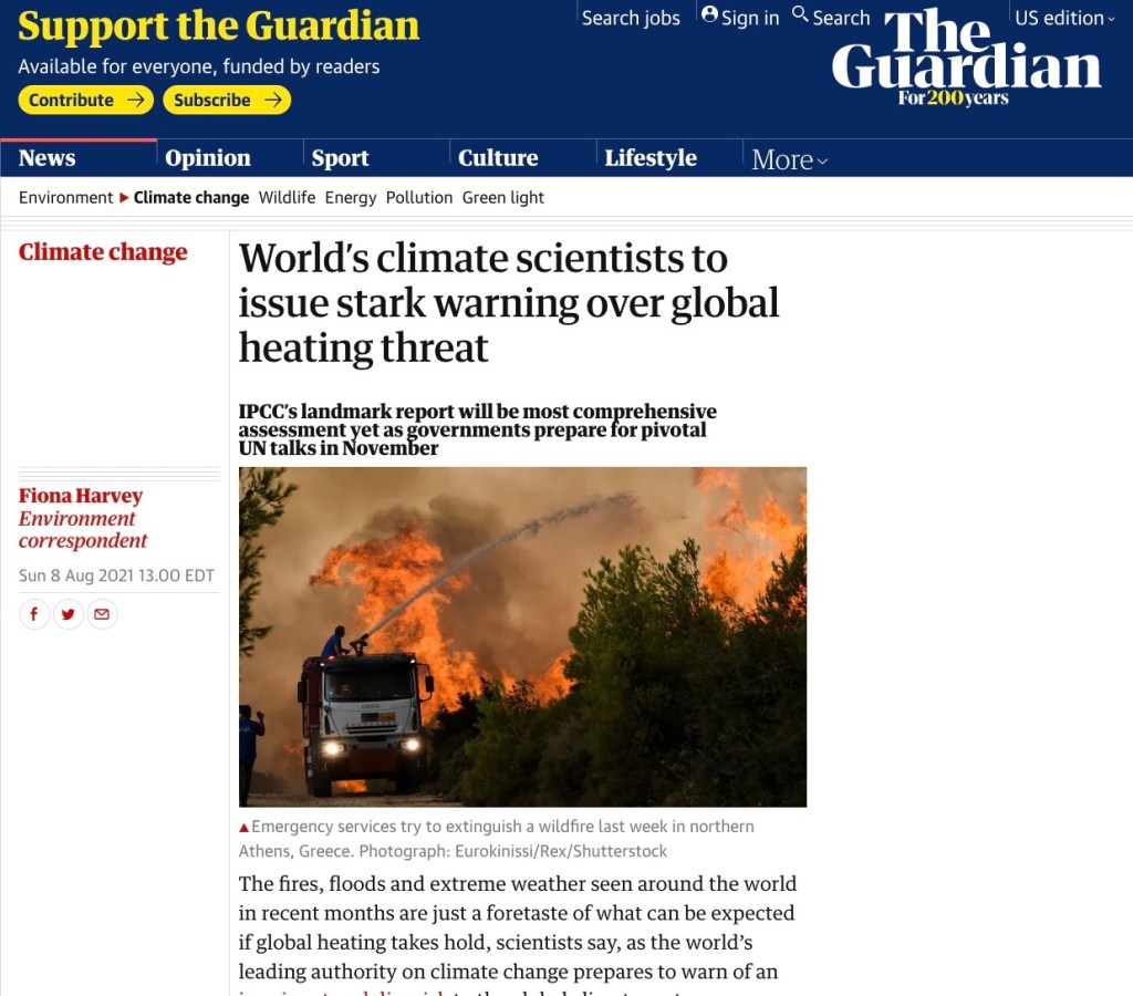 New York Times, Monday, August 9, 2021: Nations have delayed curbing their fossil-fuel emissions for so long that they can no longer stop global warming from intensifying over the next 30 years, though there is still a short window to prevent the most harrowing future, a major new United Nations scientific report has concluded. Photo: The Dixie Fire, which destroyed one town and forced thousands to flee their homes in Northern California, became the second largest wildfire in state history on Sunday.Credit…David Swanson/Reuters