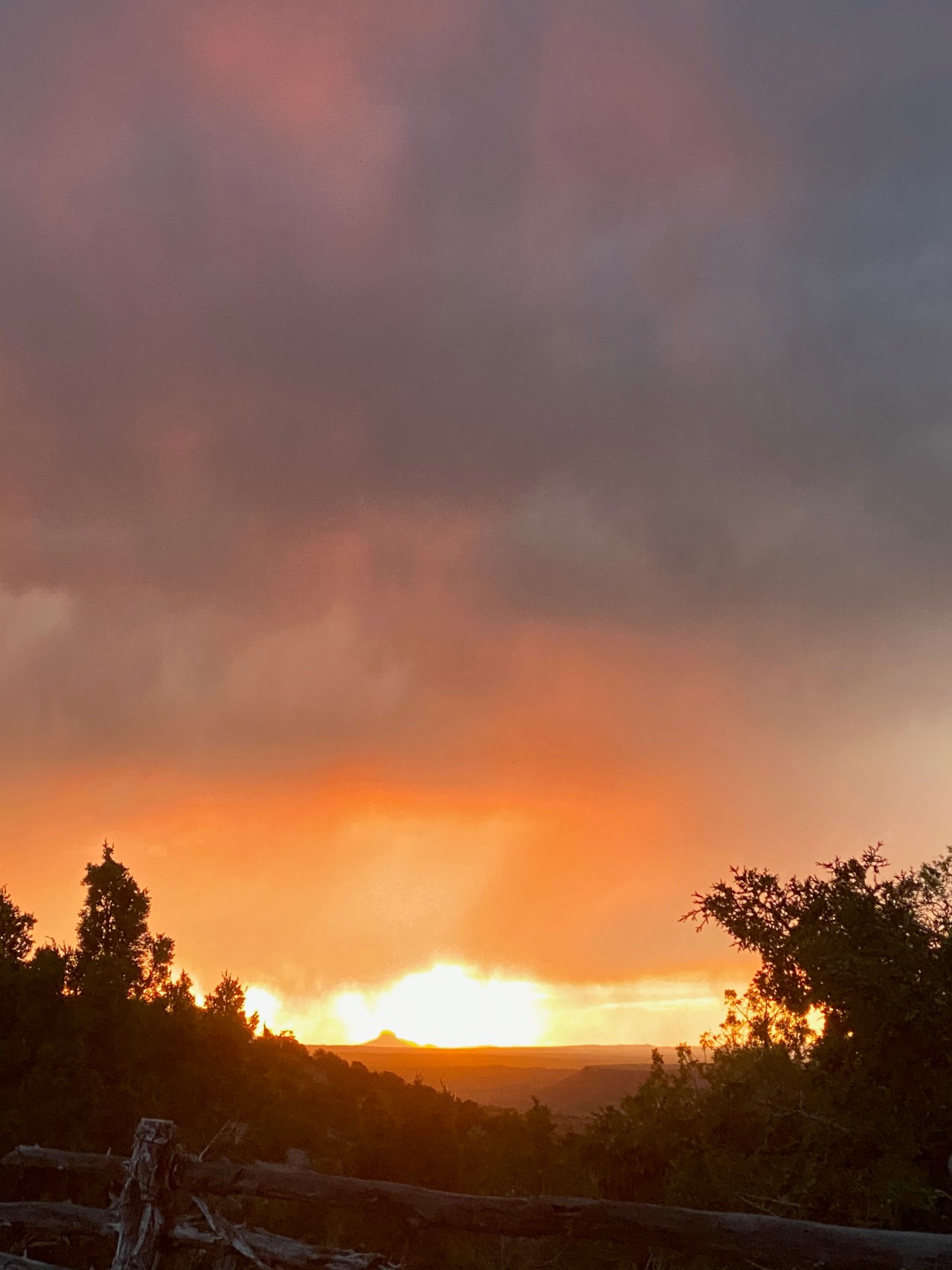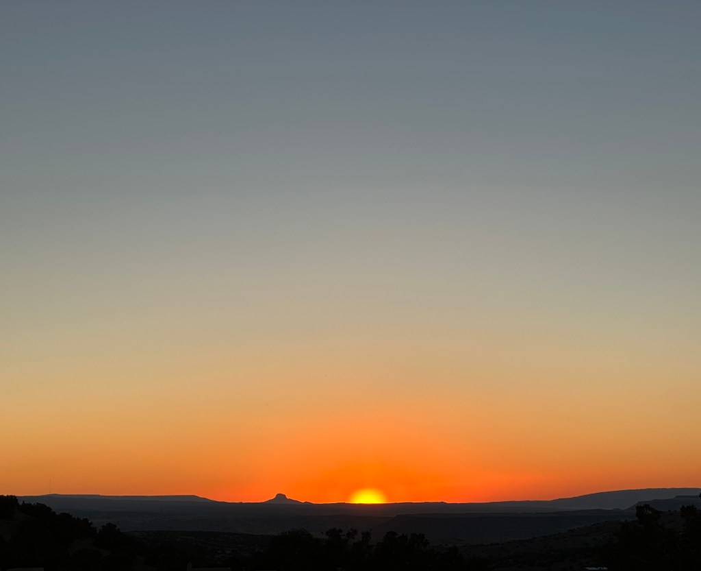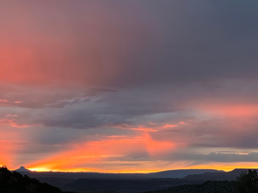 iPhone view from Placitas northeast toward Santa Fe, looking over the Cuchilla de San Francisco, opposite sunset, May 16, 2024. Sunset, May 16, west view toward Cabezon with iPhone.